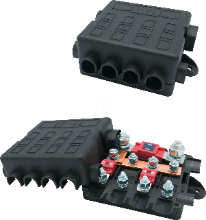 Um mehrere Snettboxen parallel zu schalten empfehlen wir einen megaOTO/midiOTO Verteiler für die Plus-Kabel. Durch die Verwendung von Standard KFZ-Sicherungen können Sie hiermit ganz einfach den  Leitungsschutz der Snettbox (Plus-Leitung) und  eines großen Verbrauchers (z.B. eines Wechselrichter) realisieren. Für die Minus-Kabel können herkömmliche Sammelschienen oder Sammelpunkte verwendet werden.